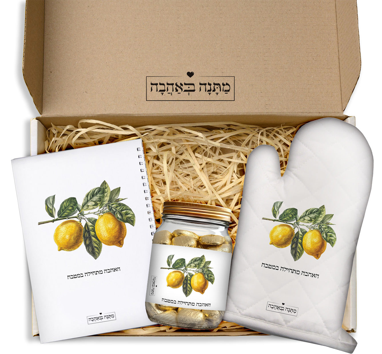 מארז למטבח לימונים: כפפה לתנור + מחברת מתכונים + צנצנת שוקולדים (מארז בינוני)