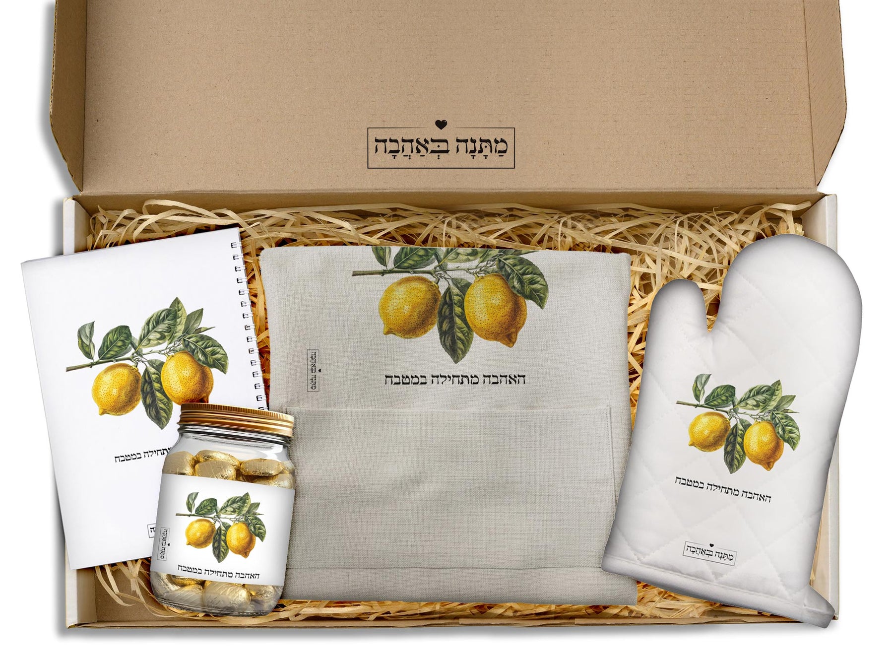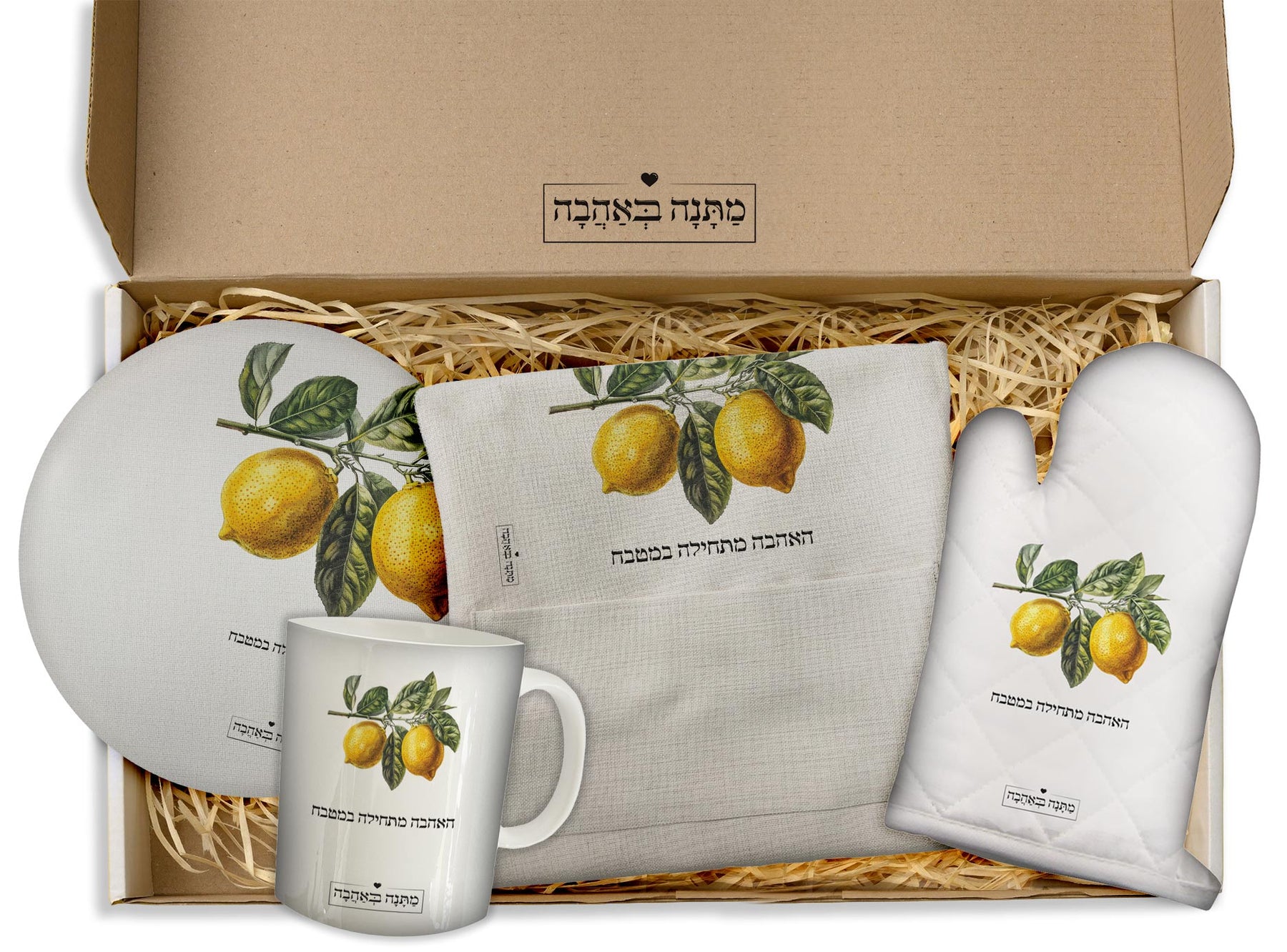 מארז למטבח לימונים: כפפה+סינר+מחברת מתכונים+תחתית לסיר (מארז גדול)