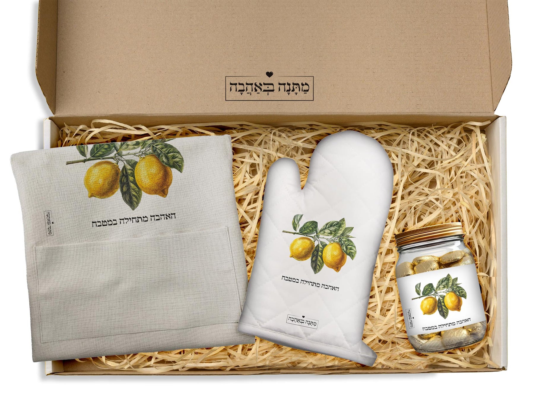 מארז למטבח לימונים: כפפה לתנור + סינר מטבח + צנצנת שוקולדים (מארז בינוני)