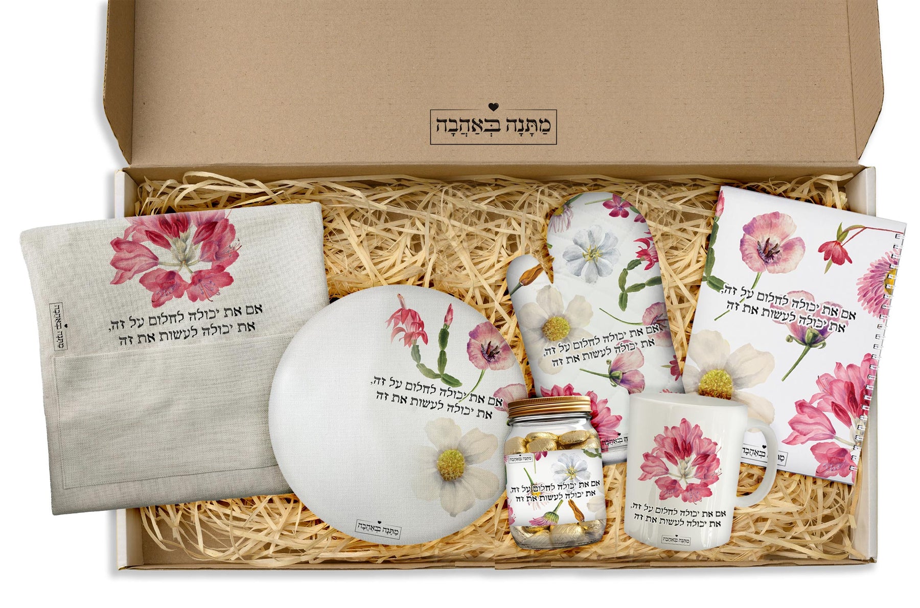 מארז למטבח פרחי בר: כפפה + מחברת מתכונים + תחתית לסיר + שוקולדים + קרש חיתוך + מגנטים (מארז ענק במיוחד)