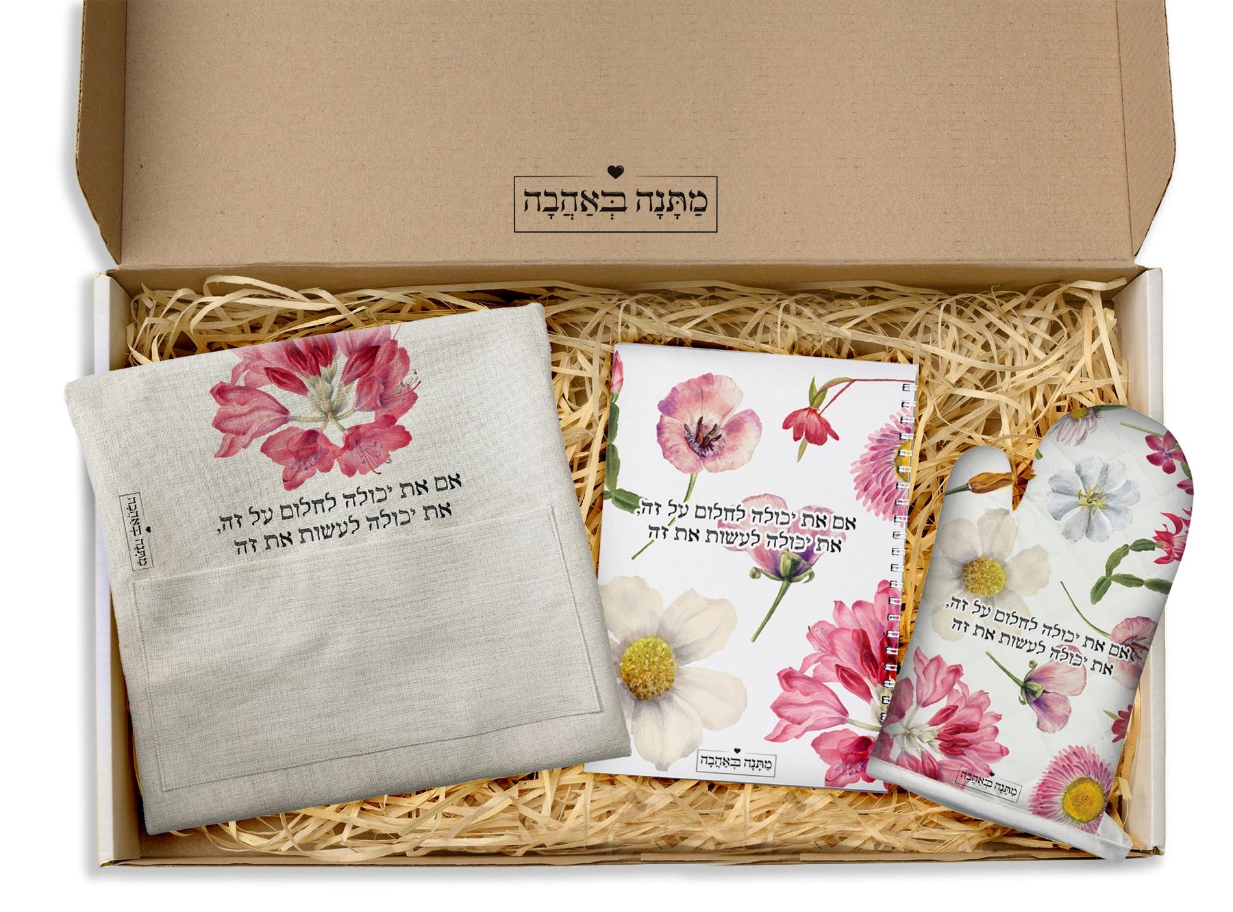 מארז מתנה למטבח דגם פרחי בר: כפפה לתנור + סינר מטבח + תחתית לסיר (מארז בינוני)