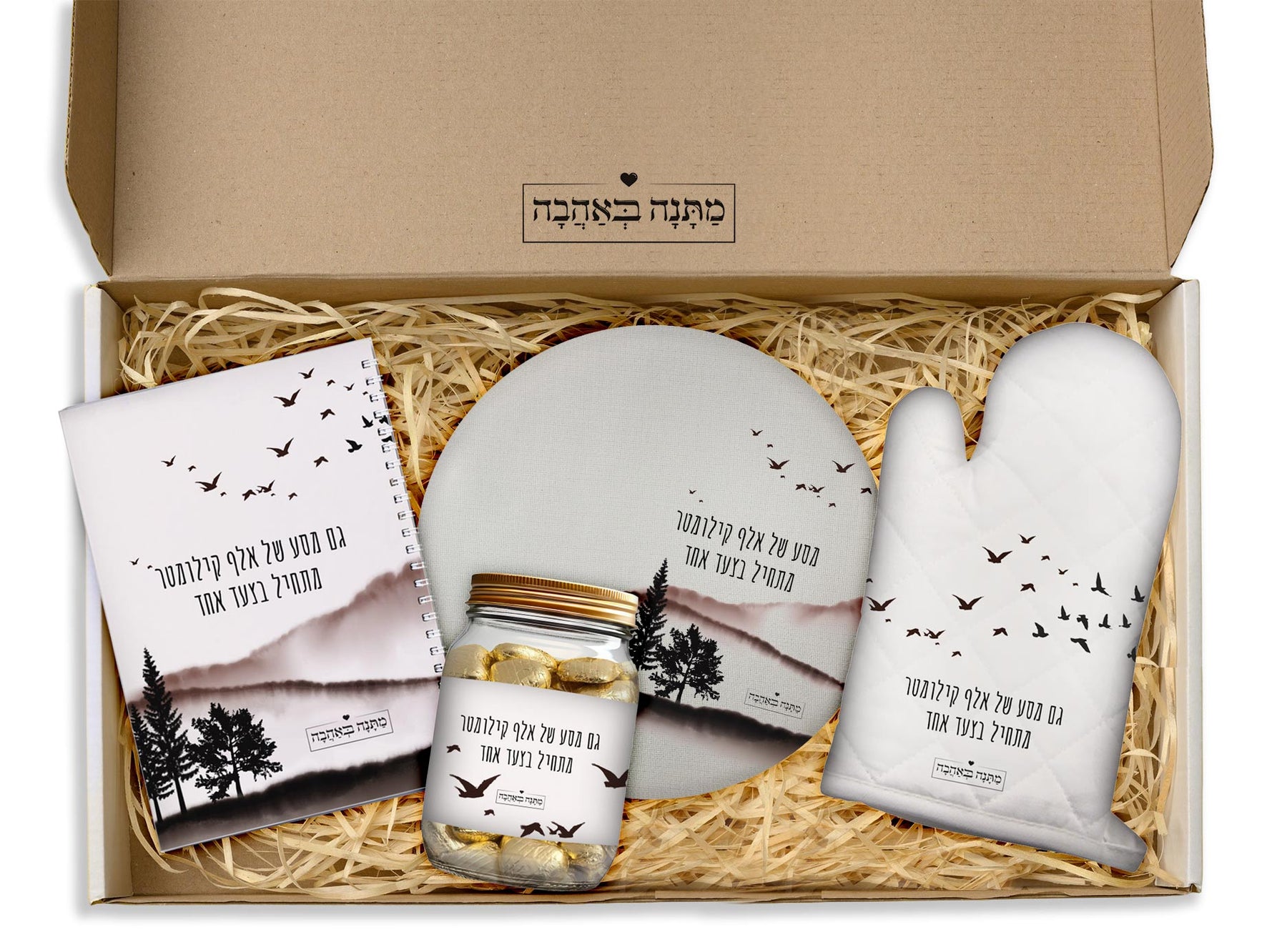 מארז למשרד שקיעה: כפפה+סינר מטבח+שוקולדים + מחברת מתכונים (מארז גדול)