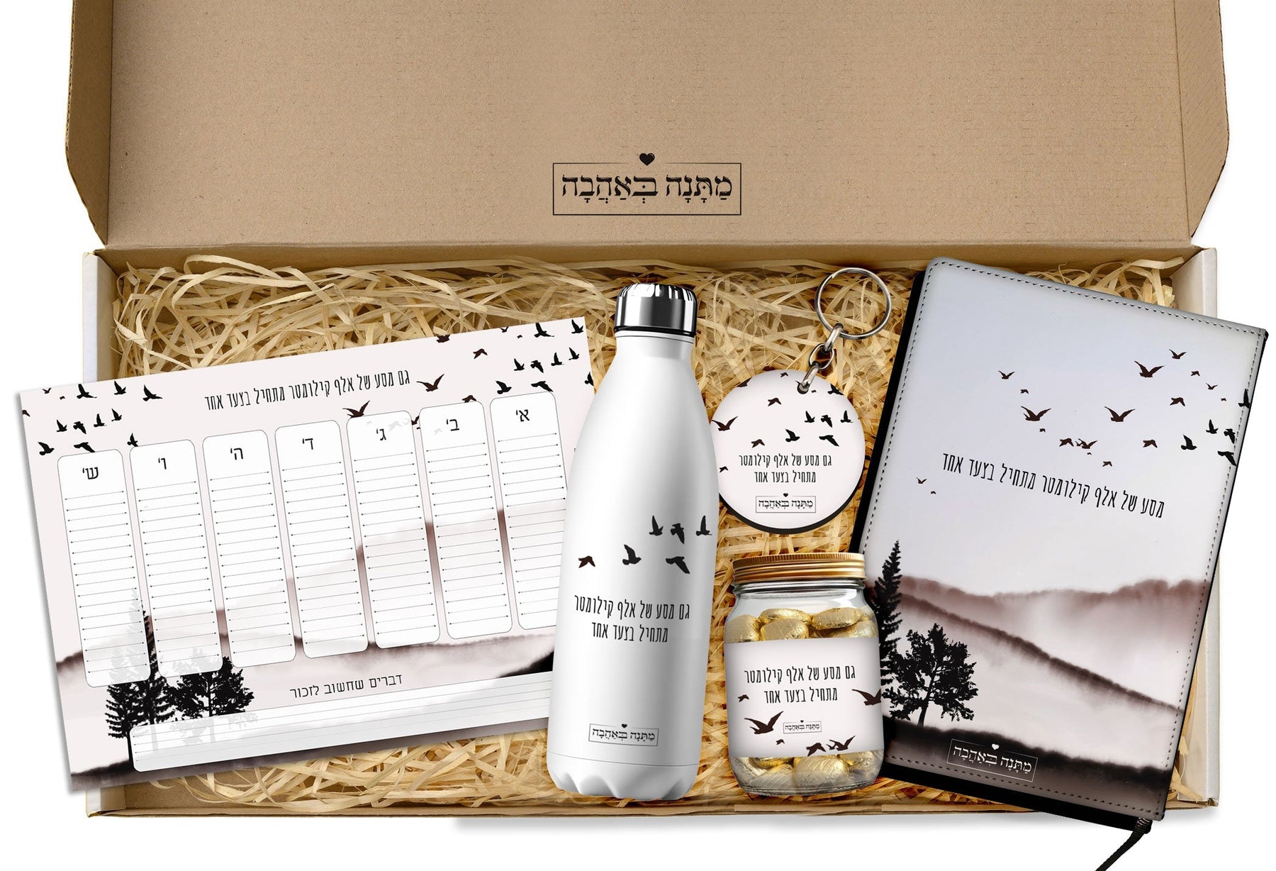 מארז למשרד שקיעה: מחברת+בקבוק+לוח שבועי+שוקולדים+מחזיק מפתחות (מארז ענק)