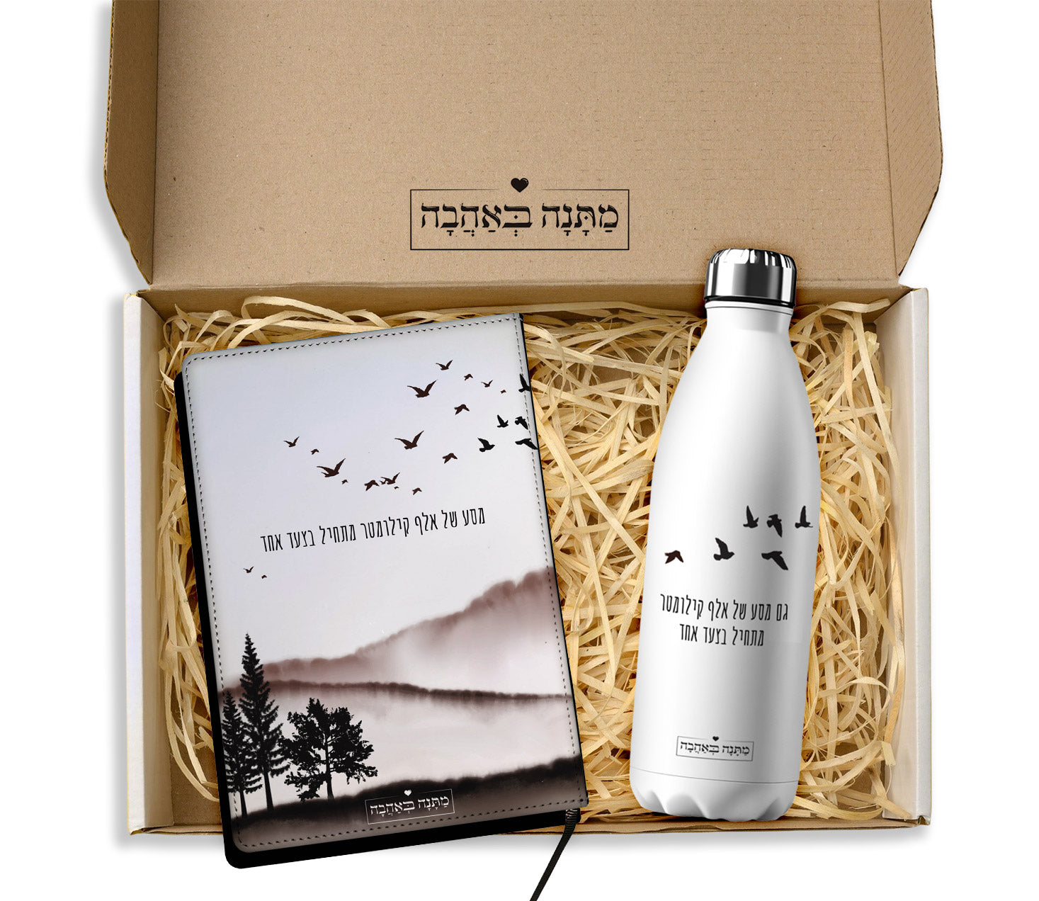 מארז מתנה למשרד דגם שקיעה: מחברת עור + בקבוק תרמי (מארז בגודל רגיל)